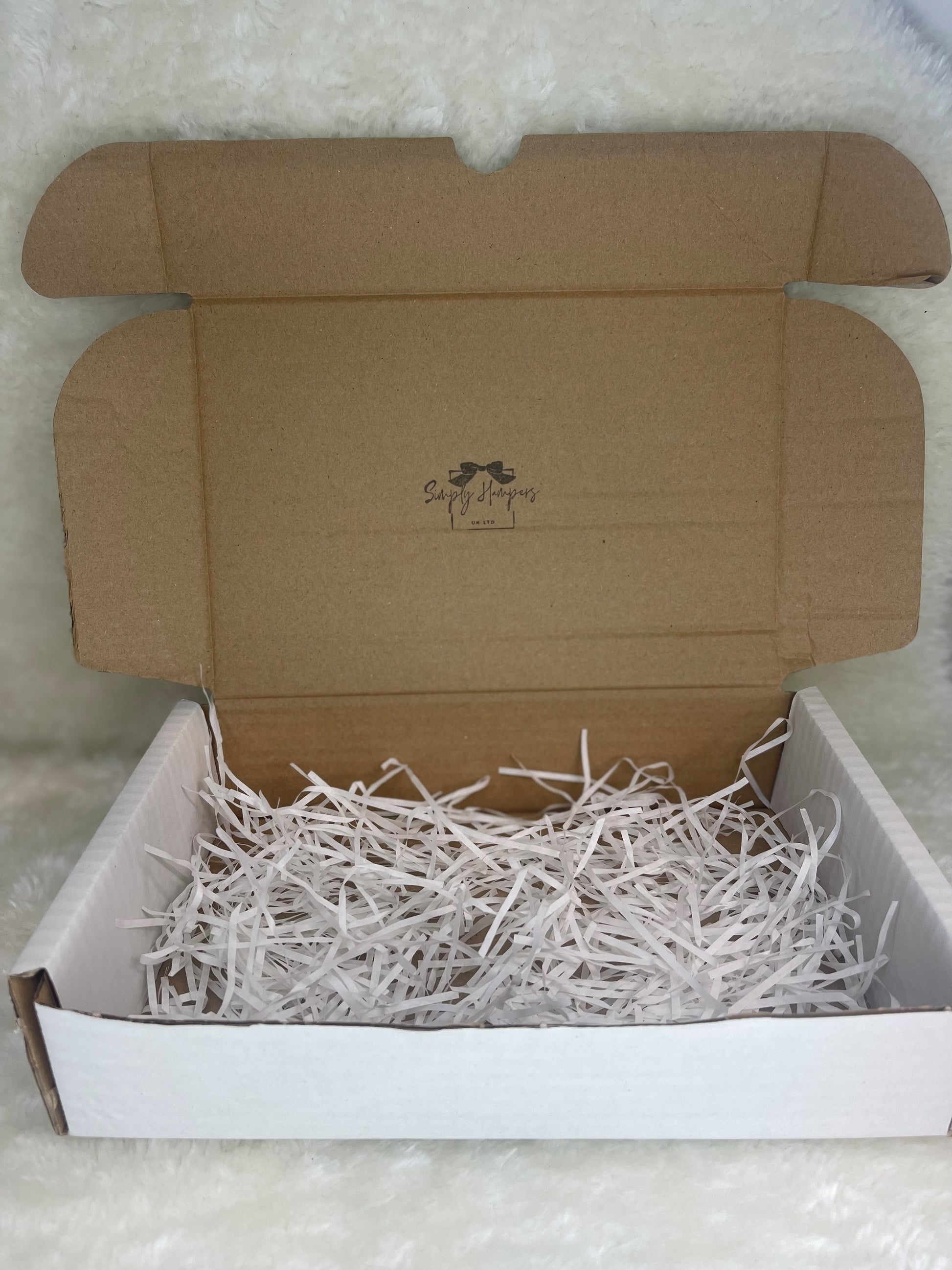 All hampers are prepped in house, and wrapped individually by the team. All pamper hampers are encased in a white box, lined with tissue paper, and tied with ribbon (colour varies) and sent in a postal bag. The pamper packs measure approx 23 x 16 x 5 cm each.